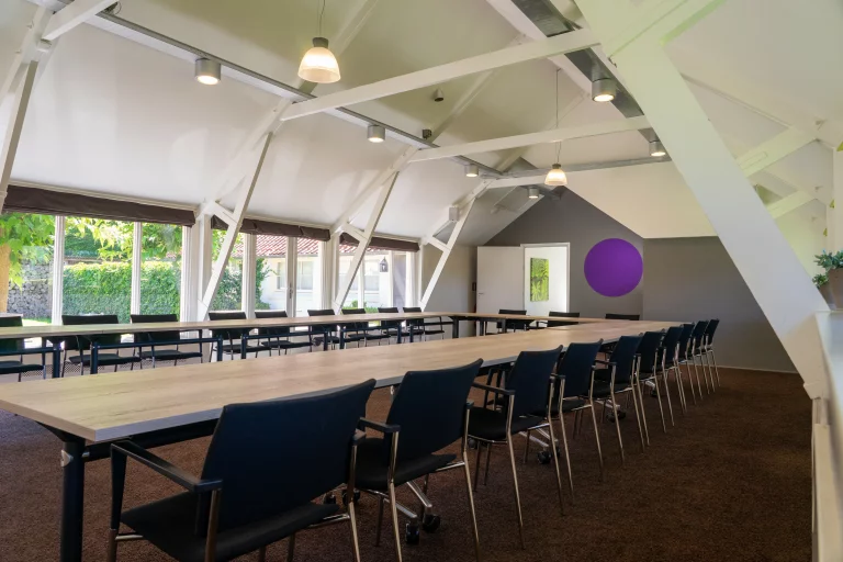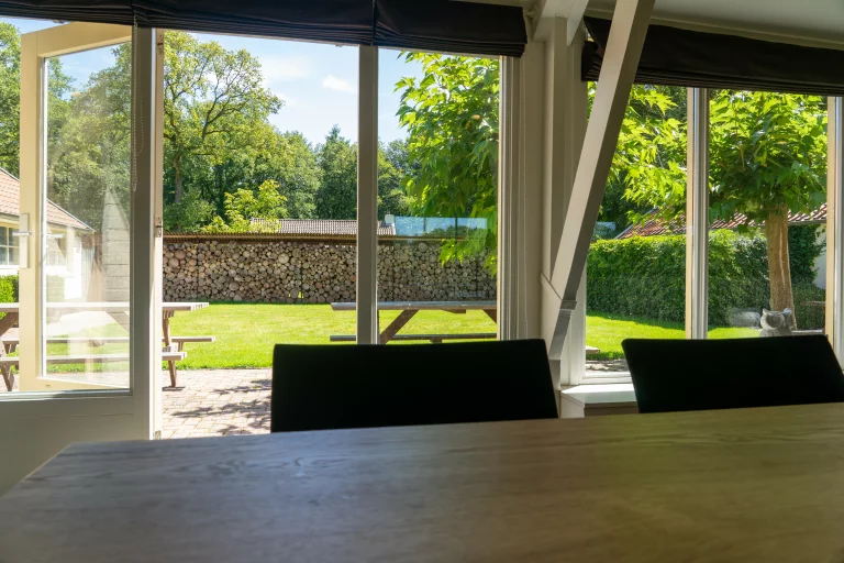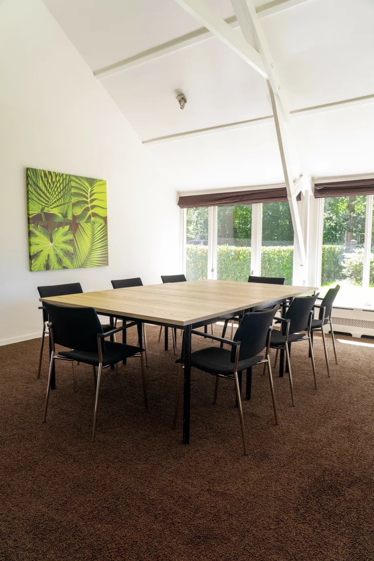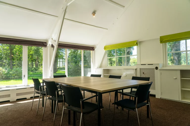 Vergader met zicht op de groene binnentuin en het aangrenzende weideveld.