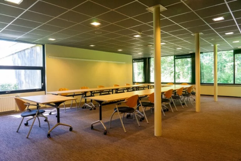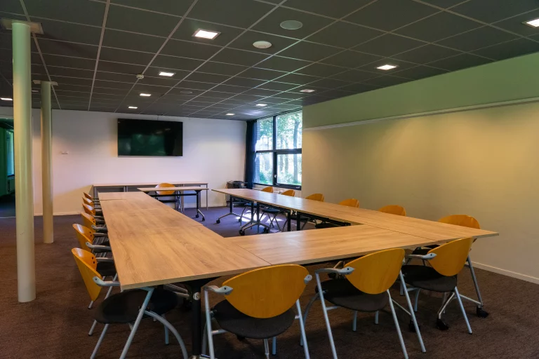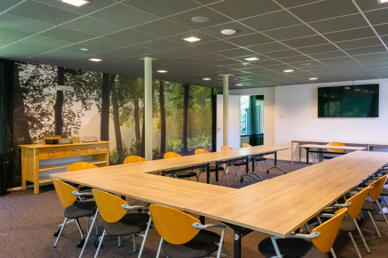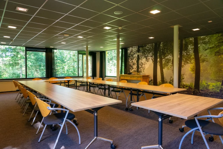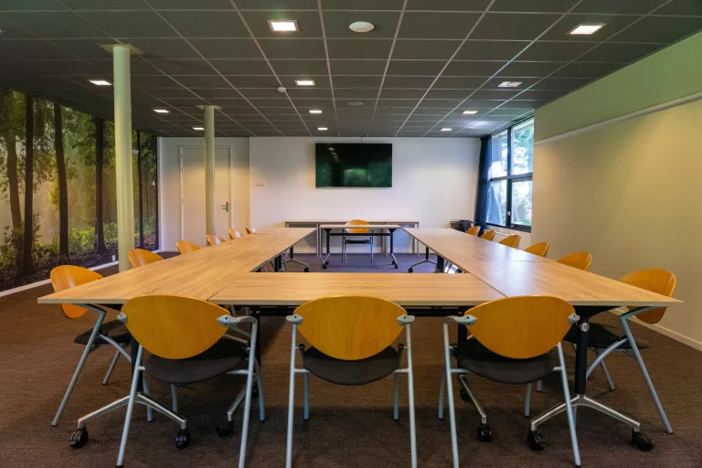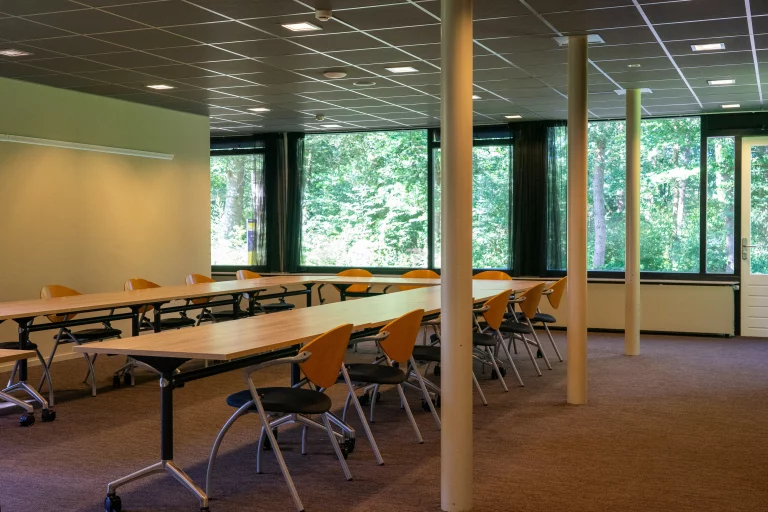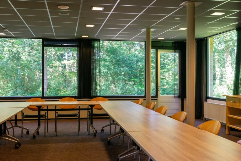 De grote ramen bieden een panoramisch uitzicht op het omringende bos en de directe verbinding met buiten maakt iedere vergaderdag hier bijzonder. Een dagdeel vergaderen kan al vanaf €26,50 per persoon.