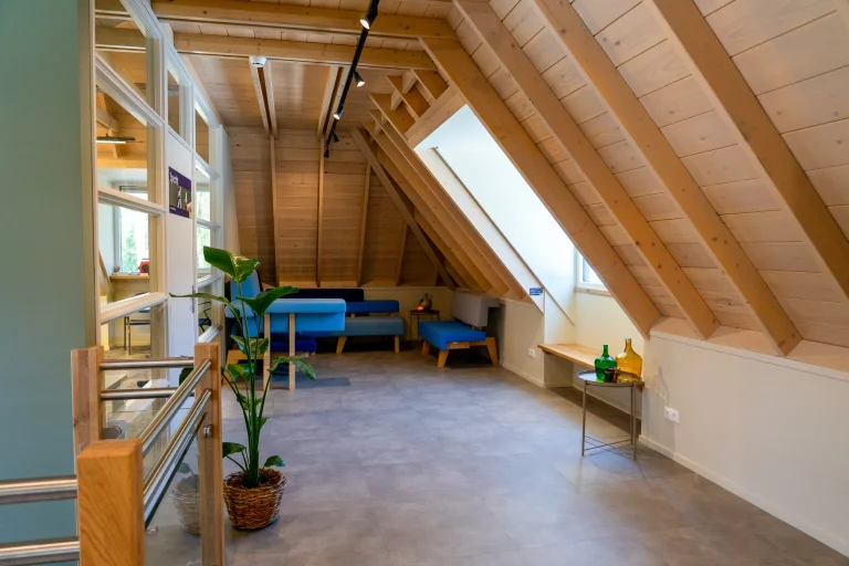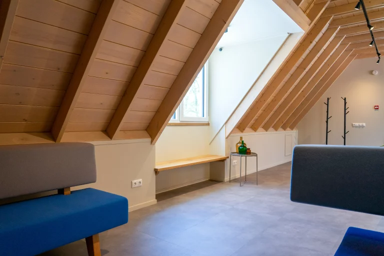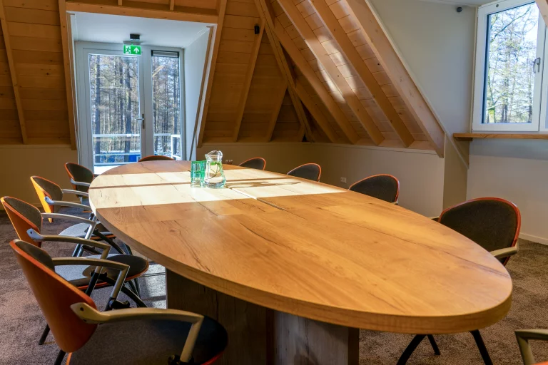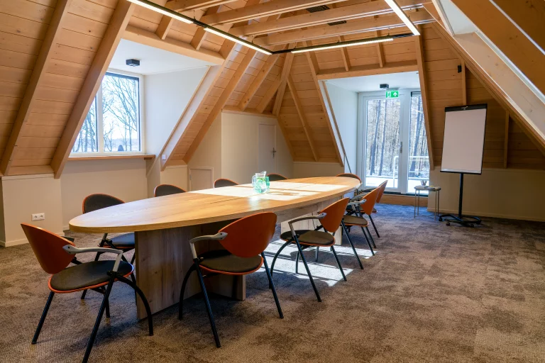 Vier royale dakkapellen zorgen voor stralend daglicht en bieden een riante blik op de heide en de kolossale boomtoppen. De combinatie van intimiteit en natuurlijk licht maakt De Specht bijzonder geschikt voor productieve vergadersessies met kleinere groepen.